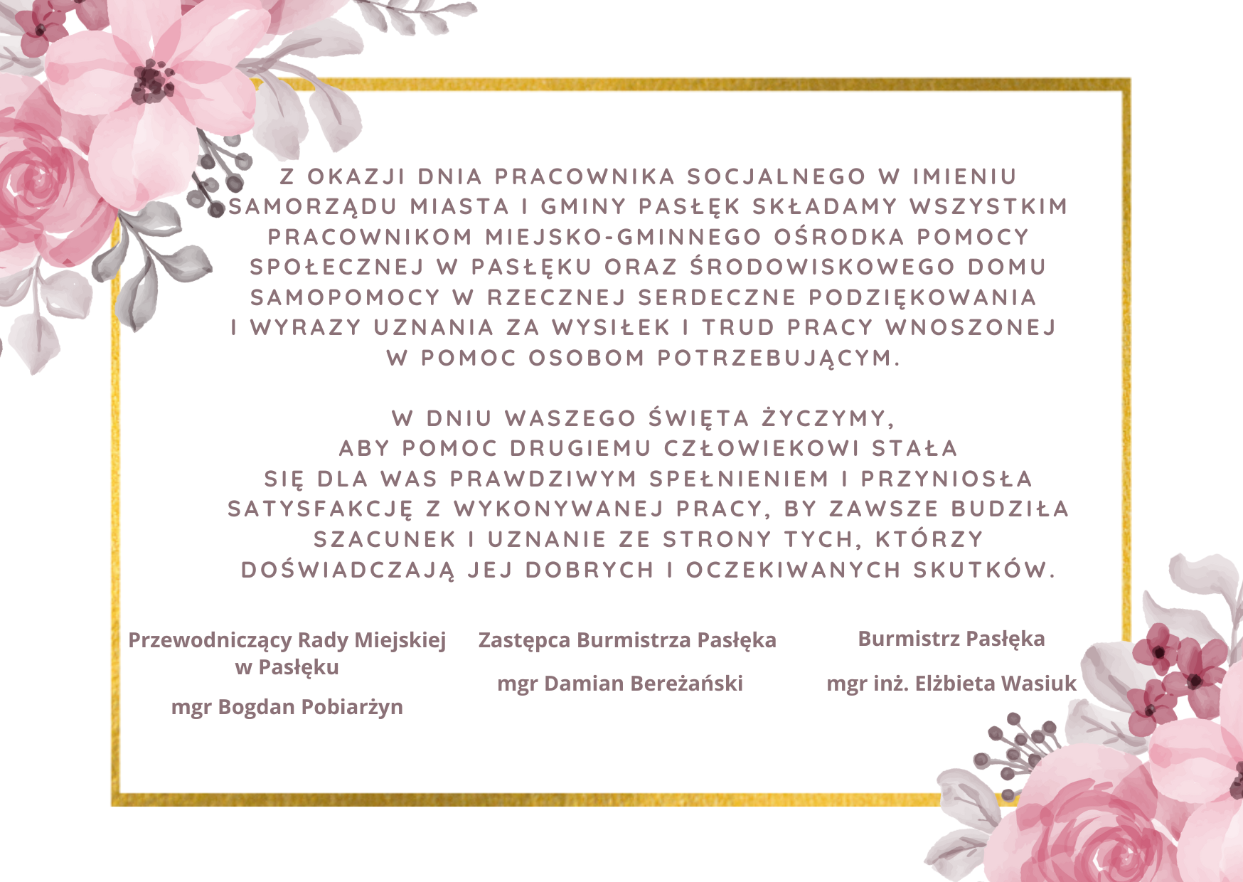 Dzień 21 listopada ustawowo ustanowiono Dniem Pracownika Socjalnego, tj. pracowników socjalnych realizujących swoje zadania na podstawie ustawy z dnia 12 marca 2004 roku o pomocy społecznej. Pracownicy socjalni pomagając rodzinom w przezwyciężaniu trudności życiowych sprawiają, że ludzie odzyskują wiarę w swoją przyszłość. Na terenie miasta i gminy Pasłęk funkcjonują dwie jednostki organizacyjne gminy Pasłęk, które zatrudniają pracowników socjalnych i realizują ww. zadania, tj. Miejsko-Gminny Ośrodek Pomocy Społecznej w Pasłęku (MGOPS) i Środowiskowy Dom Samopomocy w Rzecznej (ŚDS). Miejsko-Gminny Ośrodek Pomocy Społecznej jest jednostką organizacyjną pomocy społecznej działającej w formie jednostki budżetowej. Zakresem swojej działalności obejmuje obszar miasta i gminy Pasłęk. Celem MGOPS w Pasłęku jest w szczególności przyznawanie przewidzianych ustawą świadczeń, prowadzenie i rozwijanie niezbędnej infrastruktury socjalnej, realizacja zadań wynikających z rozeznania potrzeb społecznych, rozwijanie nowych form pomocy społecznej i samopomocy w ramach zidentyfikowanych potrzeb.